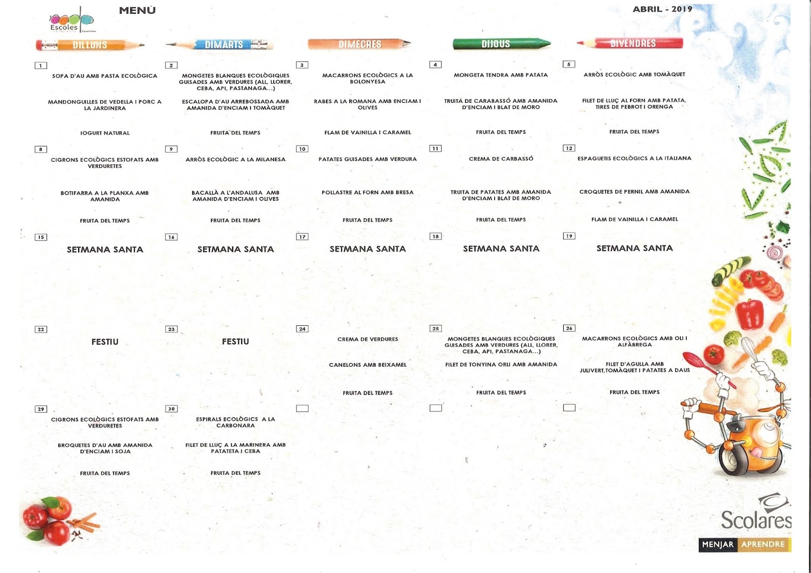 MENÚ DEL MENJADOR- MES D'ABRIL
